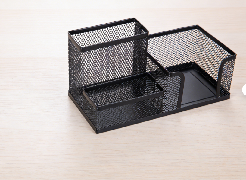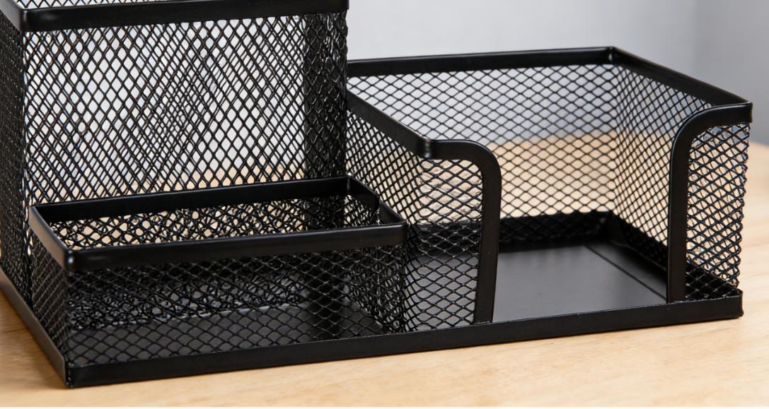 Made from metal iron, this three-compartment combination pen holder features a stable structure with industrial design appeal. Clear compartments allow for categorized storage of different stationery items, ideal for student desks or minimalist office environments.