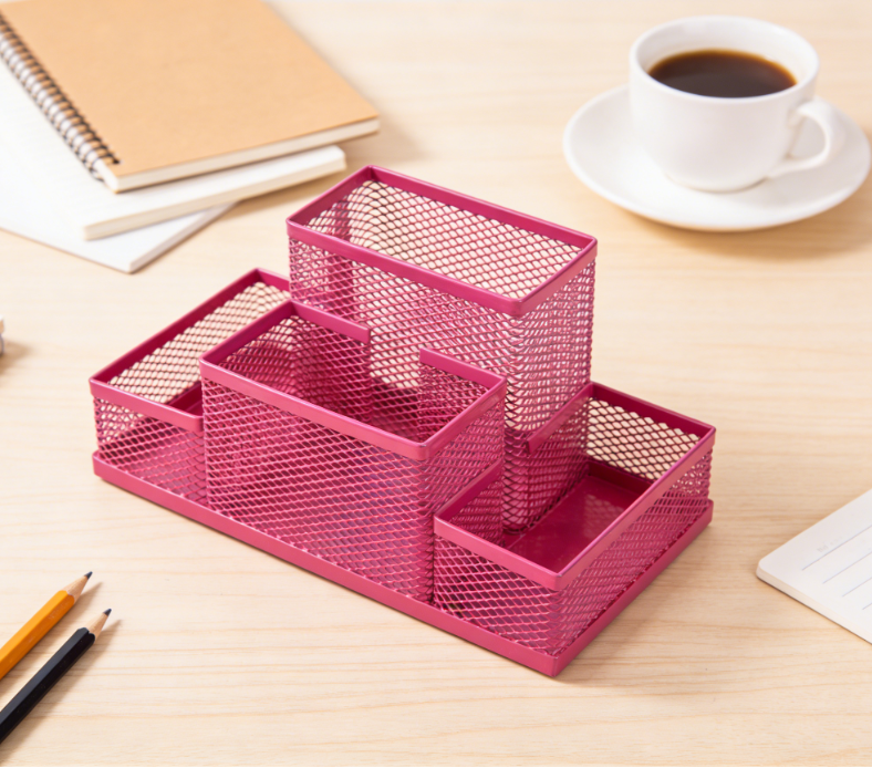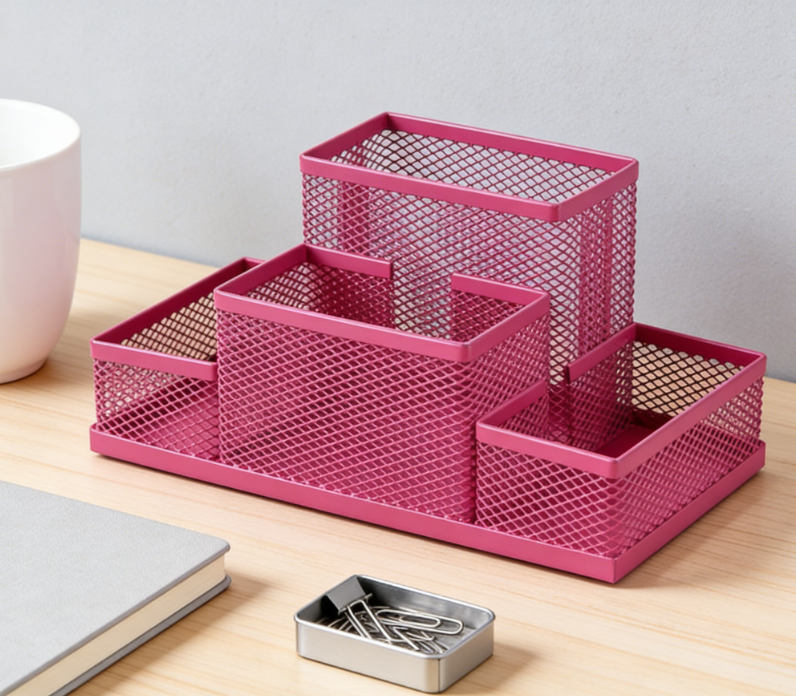 The rose red metal mesh pen holder injects a splash of color into your office or study space. Its mesh structure facilitates easy access, while the durable material ensures longevity. It effectively categorizes various stationery items, enhancing both desktop organization efficiency and visual appeal.