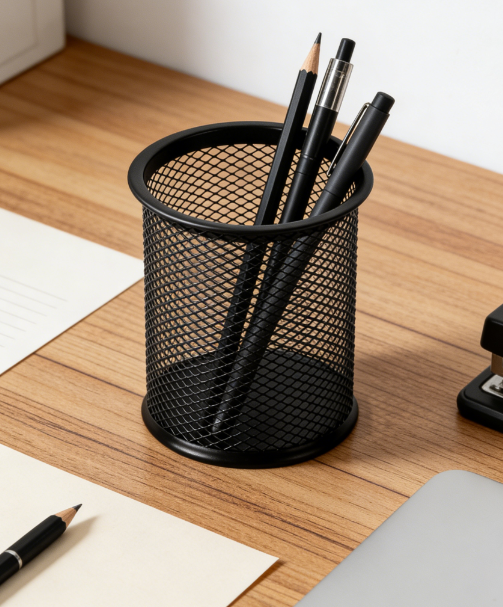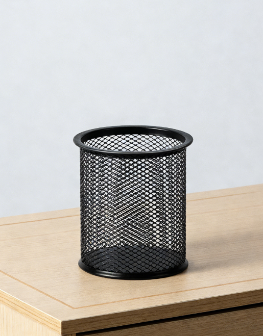 This simple metal mesh storage cup is straightforward and practical. Sturdy construction ensures long-term use, while the open design makes storing and retrieving stationery effortless—a reliable choice for basic desktop storage.