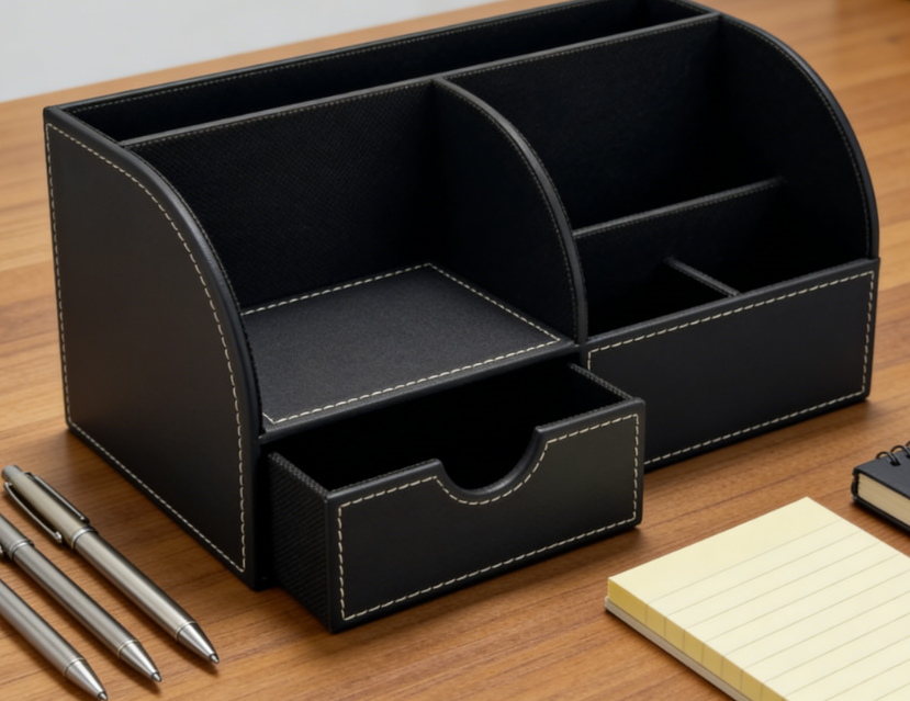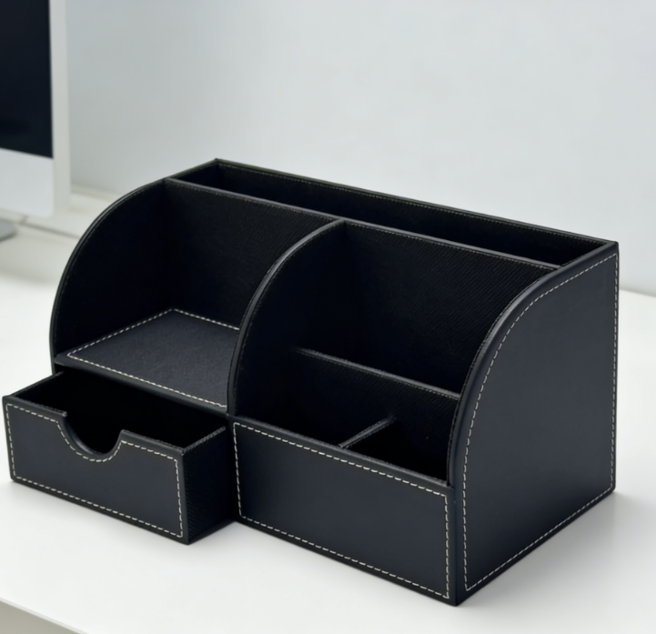 Made from textured leather with white stitching accents along the edges, this desktop organizer exudes classic business style. With multiple card slots inside, it neatly stores pens, phones, business cards, and other daily items, showcasing professional taste.